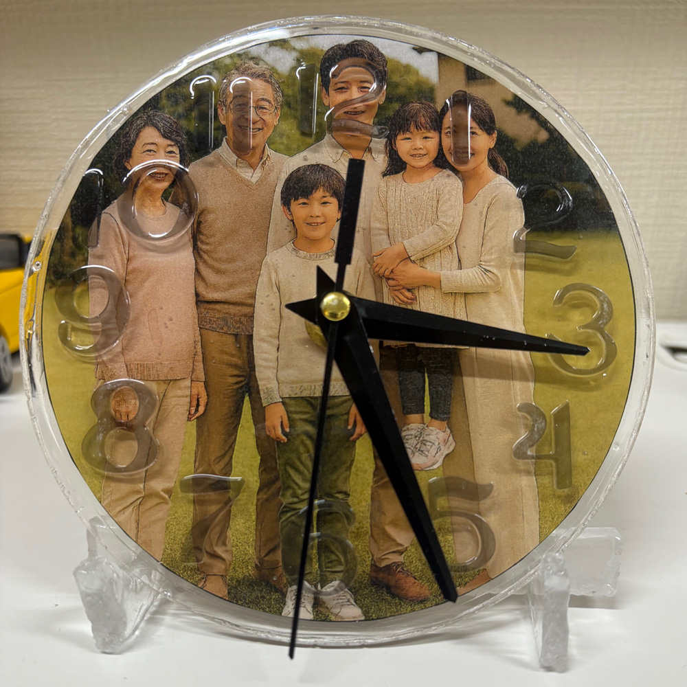 家族の集合写真を文字盤に加工しています。写真立てに入れておくだけでなく、時計という機能性を持たすことで、違和感なくお部屋になじんでくれます。